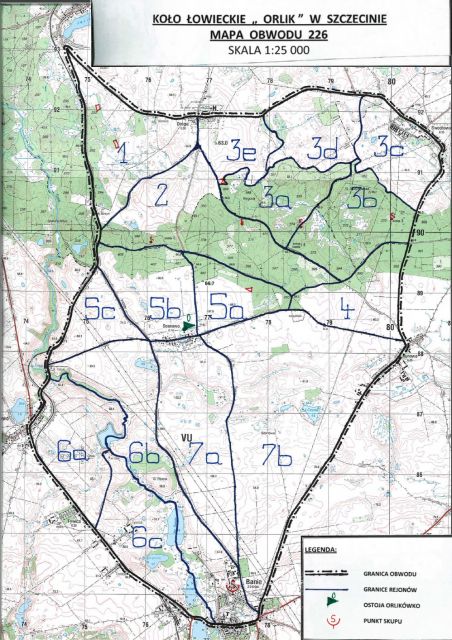 Koło „Orlik” dzierżawi trzy obwody łowieckie: jeden leśny i dwa typowo polne. Najwięcej atrakcji dostarcza ten leśny koło Przybiernowa, leżący na skraju Puszczy Goleniowskiej. Jest tu prawie 9600ha lasu, łąk i pól. Są dziki , są sarny i są jelenie, a dzięki staraniom naszych kolegów C. Biskupskiego i T. Alenkowicza – Daniele. Na początku tego wieku, pozyskaliśmy rekordową ilość jeleni , wpisując się na pierwsze miejsce wśród wszystkich kół w Polsce. Byka pozyskanego przez Stefana Śliwkę w 1991 roku wyceniono na 214 punktów CIC. Daje to piąte miejsce wśród trofeów medalowych w województwie.